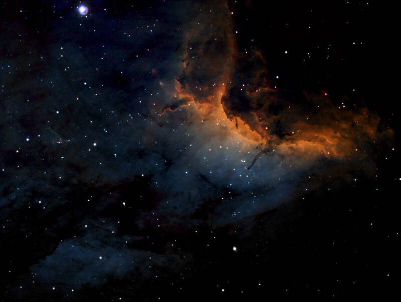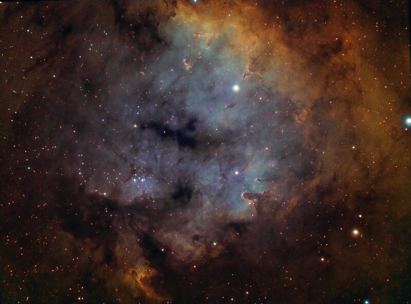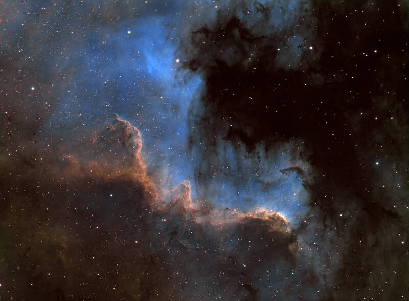 Deel Noord Amerika nevel NGC 7000 - Ruim 6 uur belicht. Narrowband filters Ha Olll Sll. 127 mm triplet Apo op f 5.2. Camera ASI 1600 mm pro. Oktober 2019 Domaine de Pradines