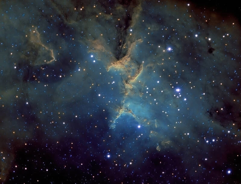 Adelaarsnevel M16. 2,6 uur belicht. Narrowband filters Ha Olll Sll. Meade 14”ACF op f6,3 reducer. Camera Atik 383L mono. September 2012. Domaine de Pradines