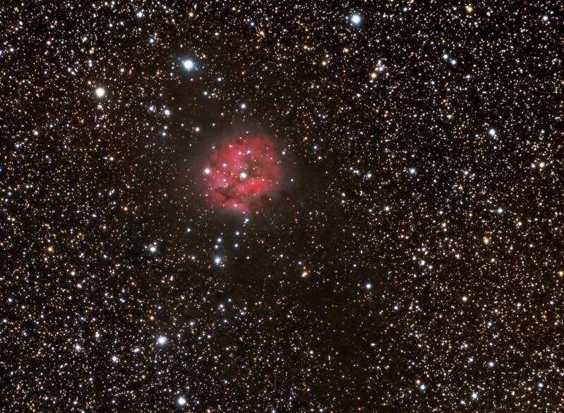 Lagoon nevel M8. 1 uur 45 min belicht. Narrowband filters Ha Olll Sll. 127 mm triplet Apo f5.2. Camera ASI 1600 mm pro. September 2019. Domaine de Pradines.