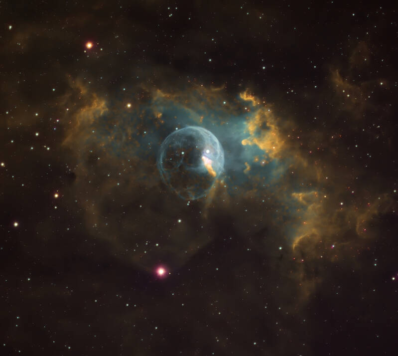 Bubbel nevel NGC 7635. 4.25 uur belicht. Narrowband filters Ha Olll Sll. Meade 14”ACF op f6,3 reducer. Camera Atik 383L mono. Oktober 2104 Almere Haven.